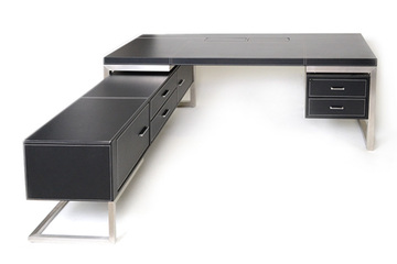 21. Schreibtisch, EKL, Eibe, 3-teilig, 2 Kastenelemente, 9 Schübe, schwarze gepunzte Lederblätter, 152x90x78cm