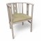 Sessel, grau lackiert, halbrund, längsgestäbt, Rückenwange m. 2 ovalen Ausschnitten, Sitz Stoff braungold weiß gestreift