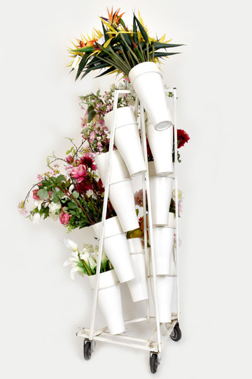 Blumenständer Metall, weiß, 3 Rollen, 10 Blumenbehälter K.stoff weiß, H165