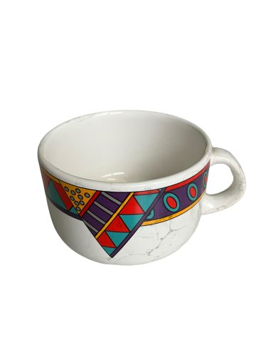 Kaffeetasse, Teetasse INDIAN SUMMER, Keramik, weiß, grau marmoriert, buntes geometrisches Muster am Rand, Service, H 6cm, ø 9cm, T 12cm, WAECHTERSBACH