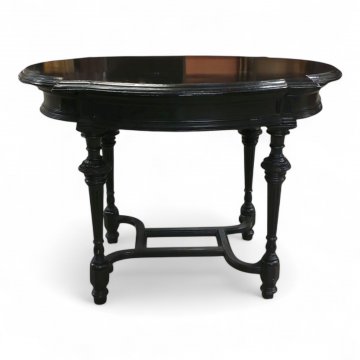 Tisch, schwarz lackiert, oval, Profilkante, Beine gedrechselt, Stegverbindungen geschwungen, L90xB63xH65