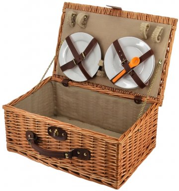 Picknickkorb mit Lederverschluß, innen gefüttert, Stoff weiß, Geschirr weiß, 2 Teller, 50x35x20