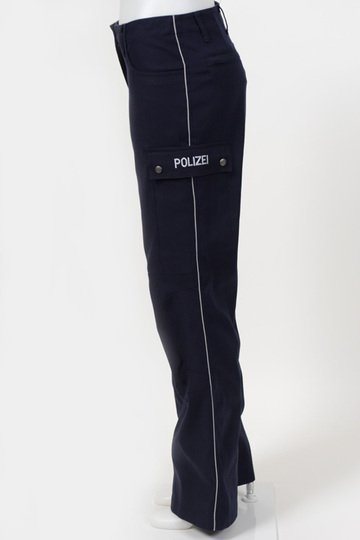 Polizeicargohose dunkelblau seitlich Reflektorpaspel silber Polizeistickerei auf Taschenklappen