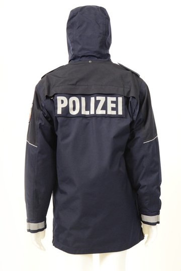 Polizeianorak dunkelblau 2tlg Polyester Schulterpasse Paspel Armwappen NRW RV Druckknöpfe Futter RV-Tasche Rückenschild
