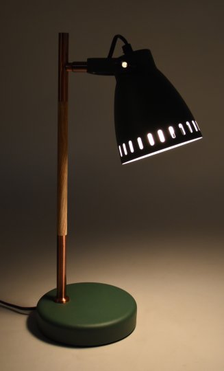 Tischlampe MINGLE, Schirm Metall grün Rand durchbrochen verstellbar, Steg Holz/kupfer, E27 max.40W, H44,5