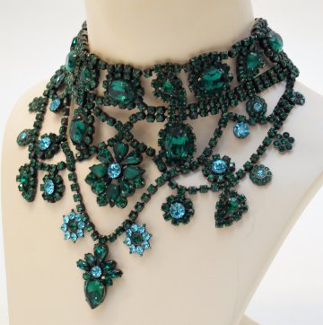 Collier grün/hellblau Strasssteine Halsband mit Blüten VM V-förmig gekreuzt mit Blüten